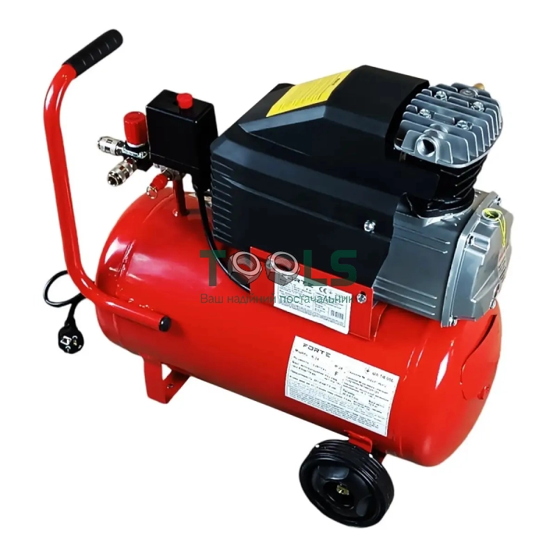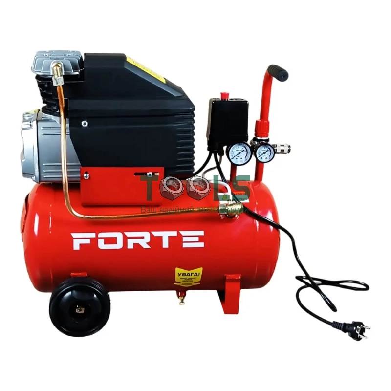 FL-24 Компрессор Поршневой компрессор FORTE FL-24 предназначен для использования в бытовых условиях, например при проведении ремонтных работ в частном доме, подключая к нему различные пневматические инструменты, также его можно использовать в небольших мастерских. Модель оборудована надежным однофазным электрическим мотором мощностью в 1.5 кВт с тепловой защитой и автоматическим повторным стартом. Цифровой манометр и регулятор давления, позволяют контролировать и выбирать наиболее оптимальный уровень давления в зависимости от сложности проводимых работ. Корпус выполнен в передвижном варианте, обладает небольшими размерами и оснащается двумя удобными транспортировочными колесами, позволяющие с легкостью перемещать прибор весом 22.5 кг с одного места на другое. На дне ресивера предусмотрен специальный клапан выброса конденсата, который образуется во время работы оборудования. Покупая компрессор FORTE FL-24 в интернет-магазине StroyTeh, Вы получаете сертифицированный в Украине товар с официальной гарантией - 1 год. Доставка по Киеву и Украине - БЕСПЛАТНО!