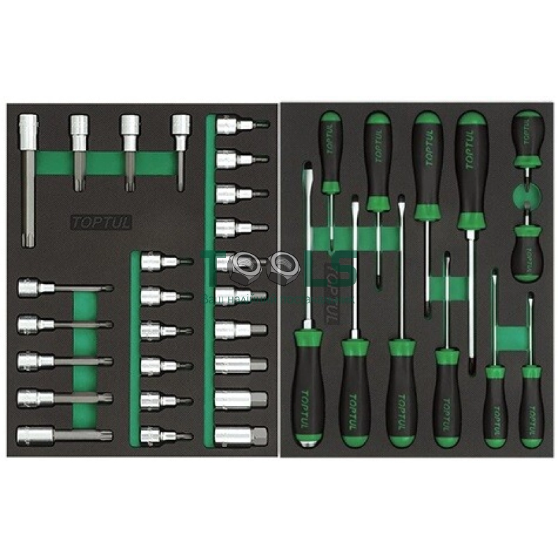 В набор входит:торцевые головки,переходники,удлинители,воротки,карданы,свечные головки,шарниры,биты,ключи,отвертки,ударный инструмент,губцевый инструмент