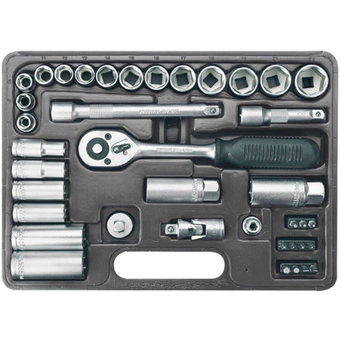 Комплектація:торцевая головка - (14 шт., 8, 9, 10, 11, 12, 13, 14, 15, 16, 17, 18, 19, 21, 22 мм), торцевая головка удлиненная - (6 шт., 8, 10, 12, 13, 17, 19 мм), биты - (11 шт., SL4, SL5,5, PH1, PH2, PZ1, PZ2, T10, T15, T20, H5, H6), кейс