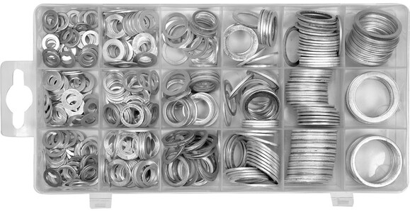 Комплектація:Шайба: 10x6x1 мм (40 шт.), 12x6x1.2 мм (40 шт.), 12x8x1 мм (40 шт.), 14x8x1 мм (40 шт.), 14x10x1 мм (40 шт.), 16x10x1 мм (40 шт.), 16x12x1.5 мм (20 шт.), 18x12x1.5 (20 шт.), 18x14x1.5 (20 шт.), 20x14x1.5 (20 шт.), 20x16x1.5 (20 шт.), 22x16x1.5 (20 шт.), 22x18x1.5 (20 шт.), 24x18x1.5 (20 шт.), 26x20x1.5 (20 шт.), 27x22x1.5 (10 шт.), 29x22x1.5 (10 шт.), 29x24x2 (10 шт.),пластиковый футляр